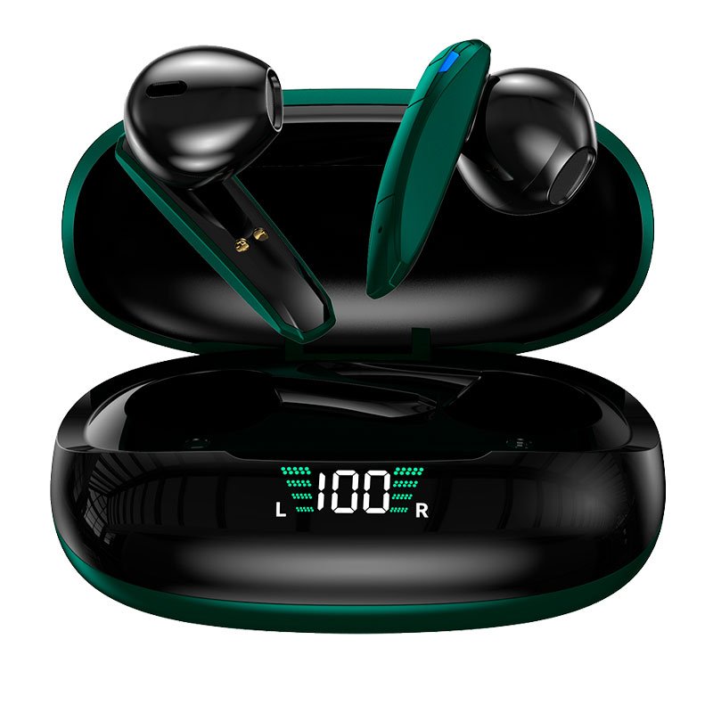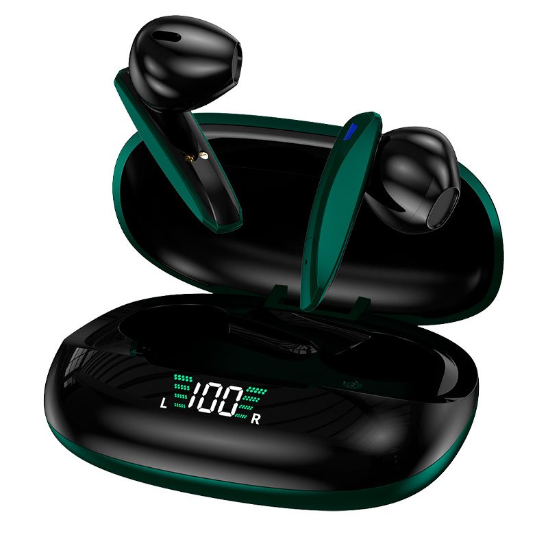 1. Abre la caja de carga y saca los auriculares. La luz azul parpadeará lentamente, y los auriculares se encenderán.