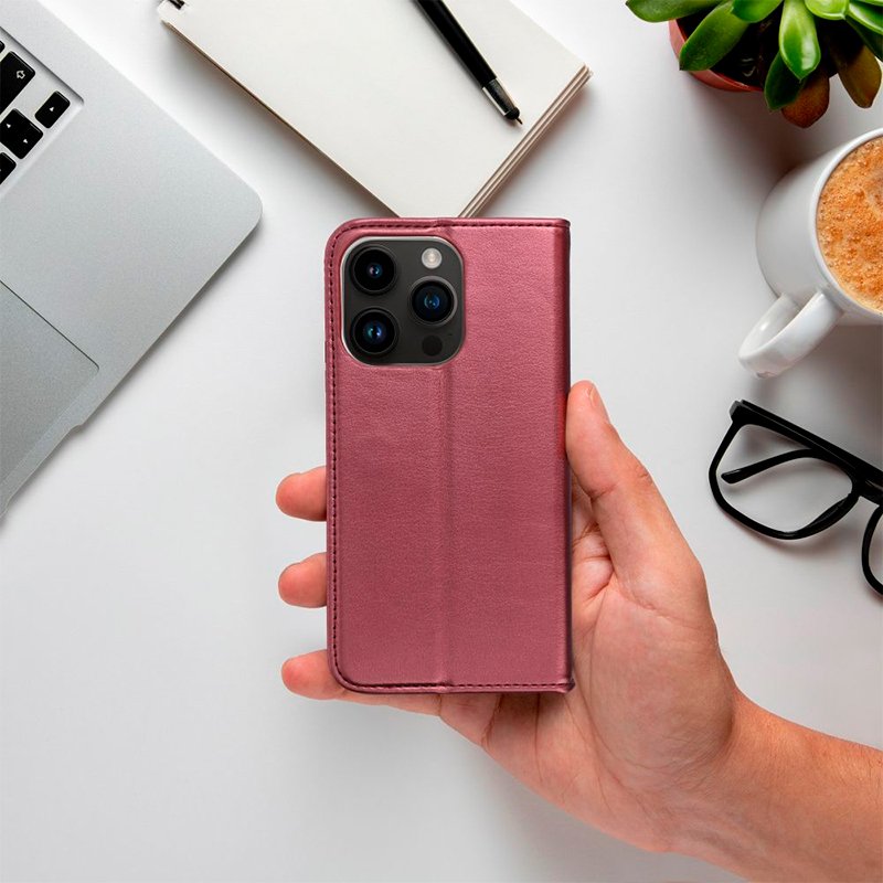 Apertura lateral tipo libro. Incorpora una carcasa específica del modelo de smartphone, para incrustarlo y dejarlo perfectamente encajado.